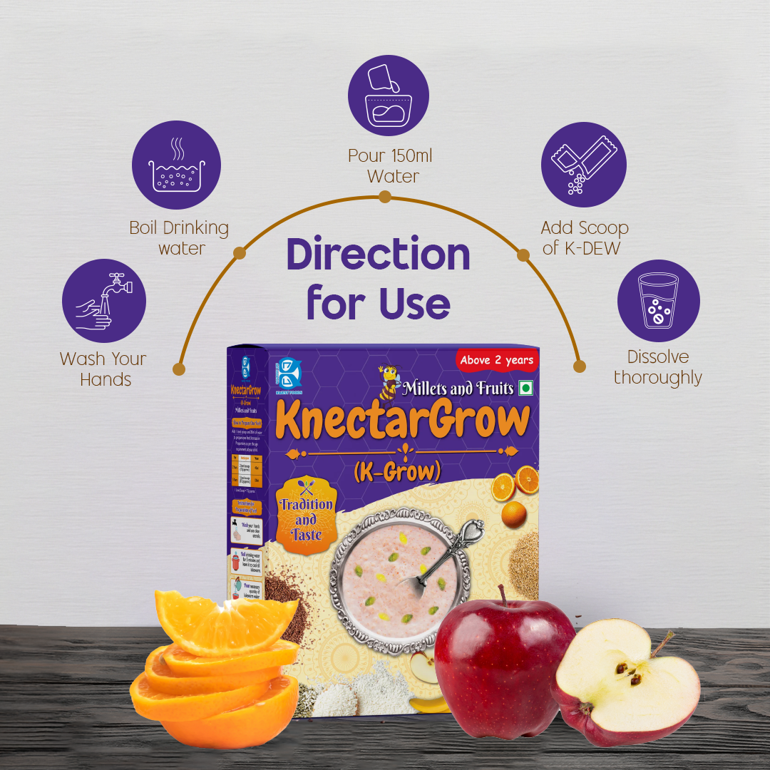 Milk Solids, Extruded Foxtail Millet Powder, Extruded Bajra Powder, Extruded Jowar Powder, Extruded Ragi Powder, Sugar Powder, Maltodextrin, Extruded Rice Crispies, Malt extract, Spray Dried Banana Powder, Spray Dried Strawberry Flakes, Spray Dried Orange Powder, Spray Dried Apple Powder, Bifidogenic Probiotics, Vitamin Premix and Mineral Premix