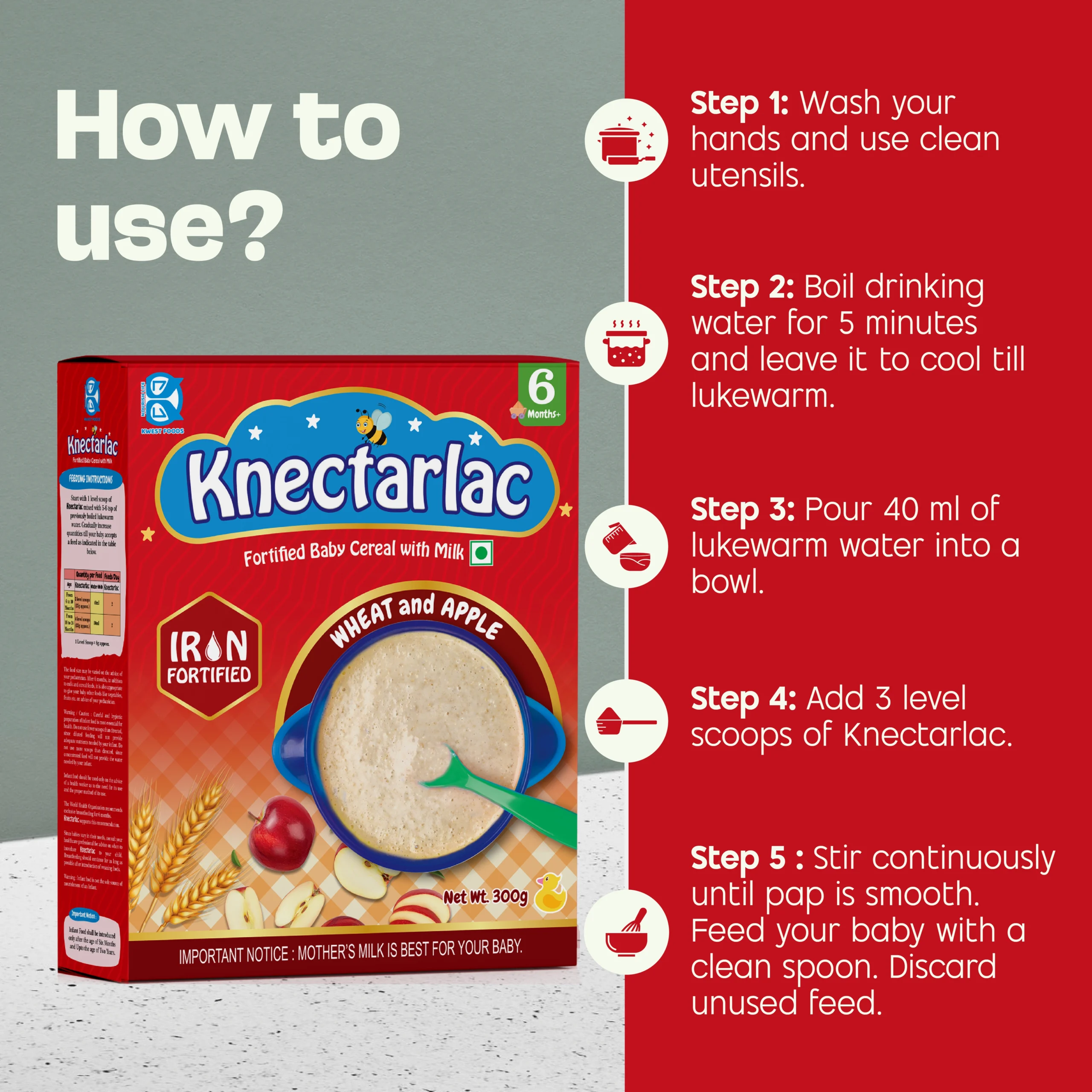 Start with 1 level scoop of Knectarlac mixed with 5-6 tsp of previously boiled lukewarm water. Gradually increase quantities till your baby accepts a feed as indicated in the table below.