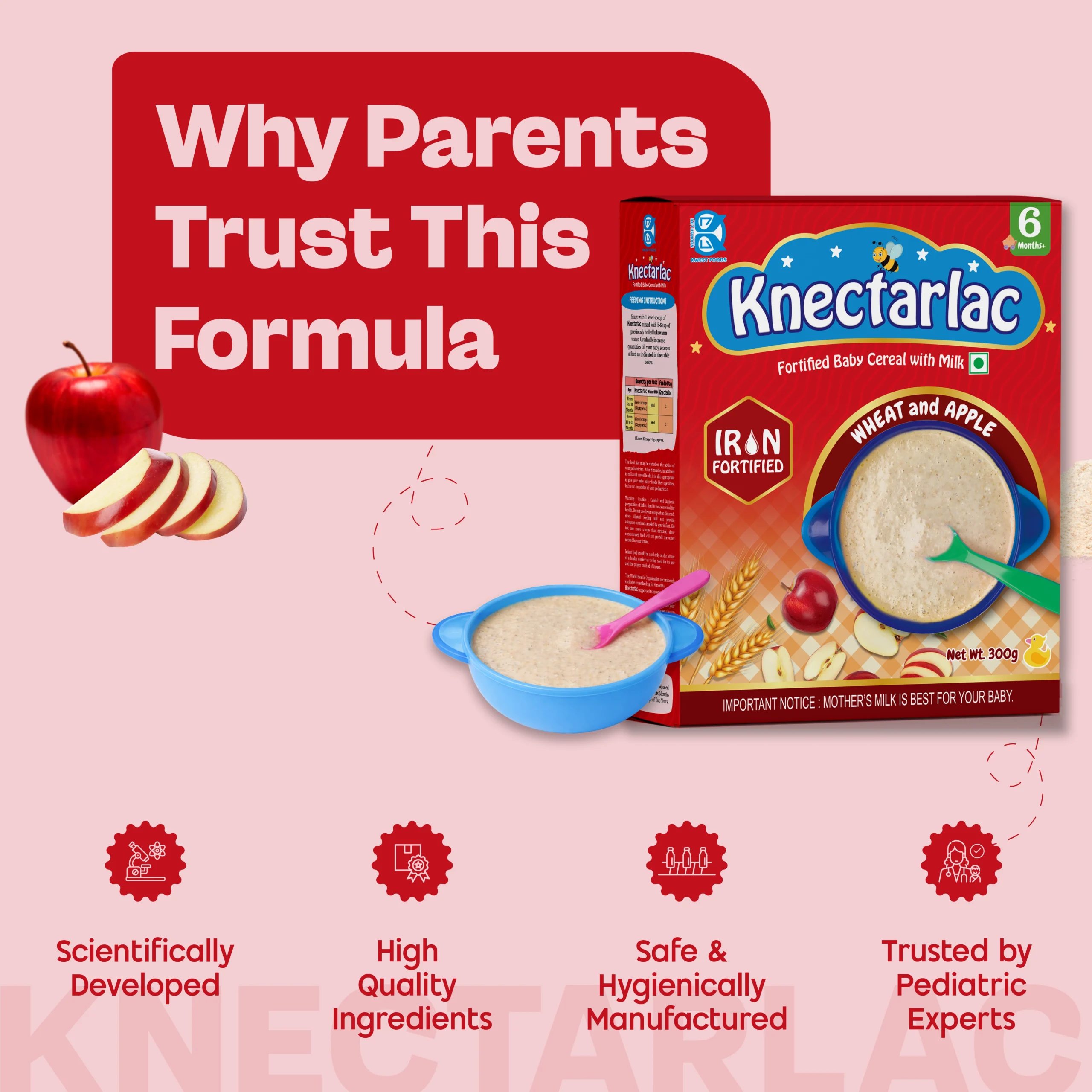 Wheat Flour, Whole milk Powder and Skimmed Milk Powder, Sugar, Maltodextrin, Dehydrated Apple Flakes, Malt Extract, Guargum, Vitamins and Minerals.