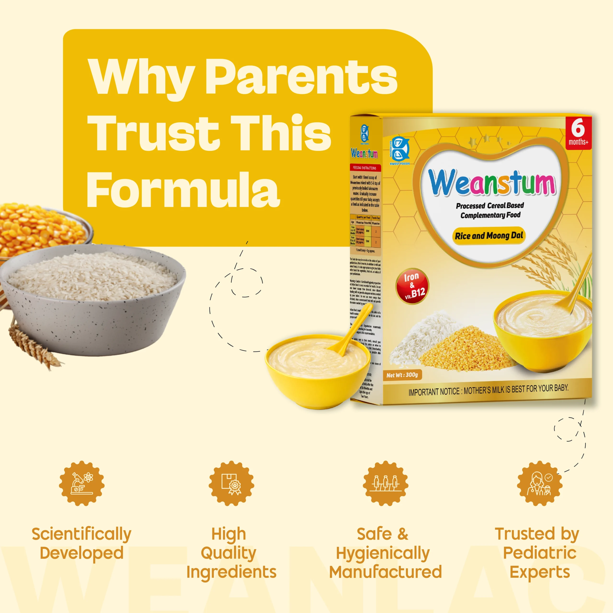 Start with 1 level scoop of Weanstum mixed with 5–6 tsp of previously boiled lukewarm water. Gradually increase quantities till your baby accepts a feed as indicated in the table below.