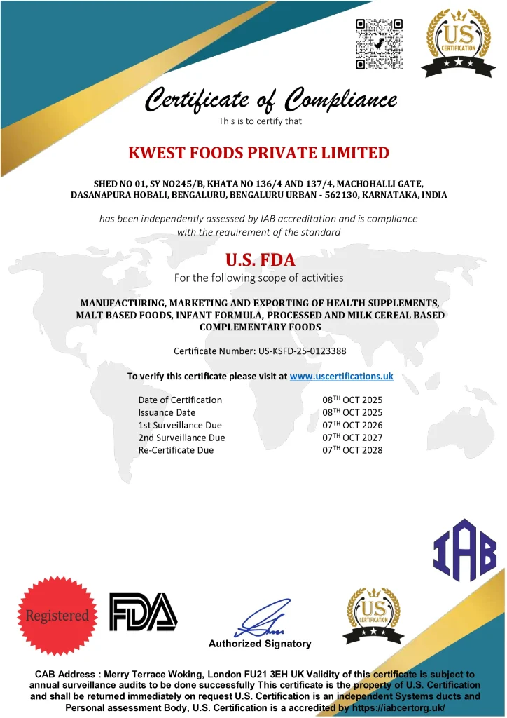 Kwest Foods Private Limited is registered with the U.S. Food and Drug Administration (FDA), ensuring compliance with U.S. food safety regulations. This reflects the company’s commitment to maintaining high standards of quality, safety, and reliability in food manufacturing.