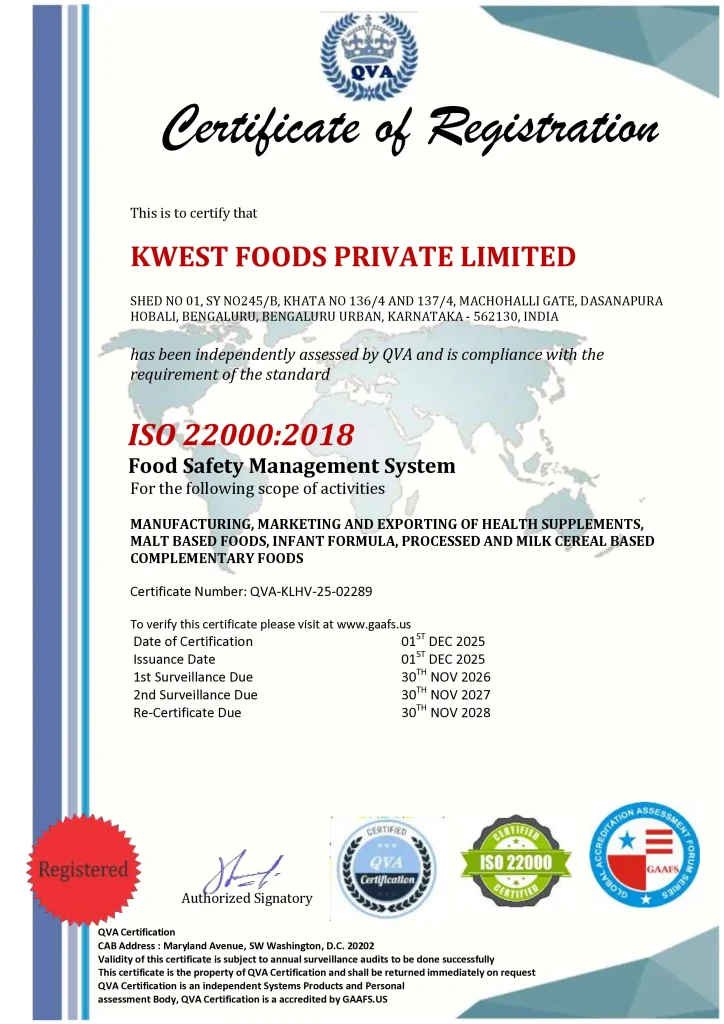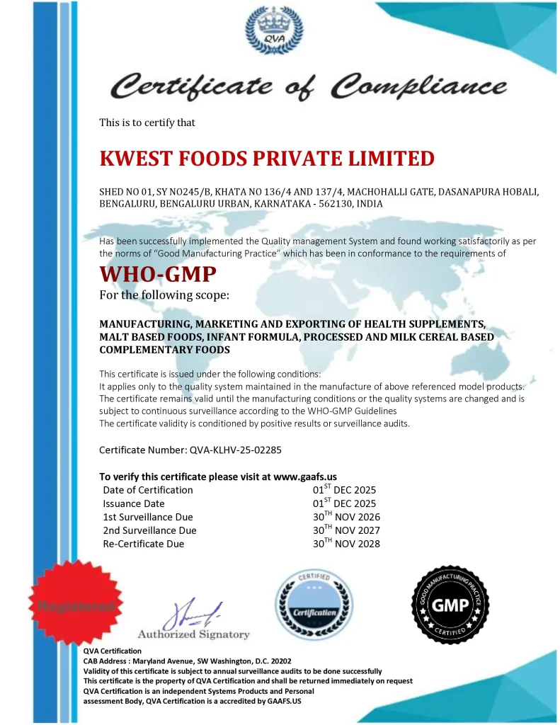 Kwest Foods Private Limited is a WHO-GMP certified manufacturing facility engaged in the manufacturing, marketing, and exporting of health supplements, malt-based foods, infant formula, and processed milk cereal -based complementary foods. The facility operates in compliance with Good Manufacturing Practices and is licensed by relevant statutory authorities, ensuring consistent quality, safety, and regulatory compliance.