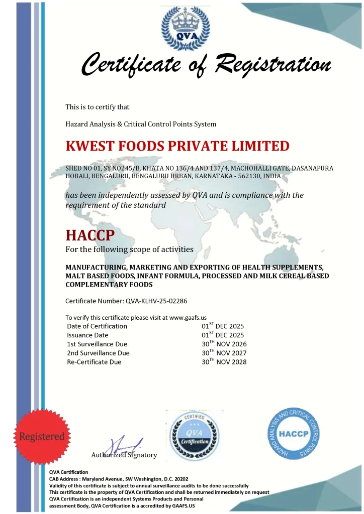 Kwest Foods Private Limited is certified under the HACCP system, ensuring systematic identification and control of food safety hazards during production. This certification reflects the company’s commitment to maintaining high standards of hygiene, safety, and quality in food manufacturing.
