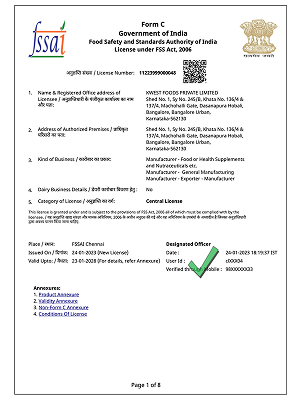 Kwest Foods Private Limited holds a valid license from the Food Safety and Standards Authority of India (FSSAI), authorizing the manufacture and distribution of food products. It ensures compliance with national regulations for food safety, quality, and hygiene standards.